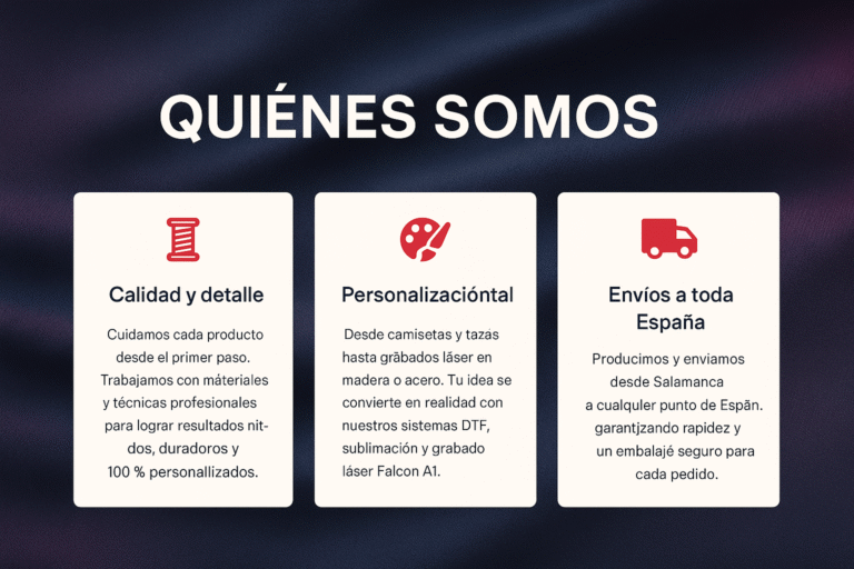 Trabajamos con tecnología DTF, sublimación, vinilo textil y grabado láser, para ofrecer el mejor acabado posible en camisetas, sudaderas, tazas, llaveros, marcos, botellas y mucho más.